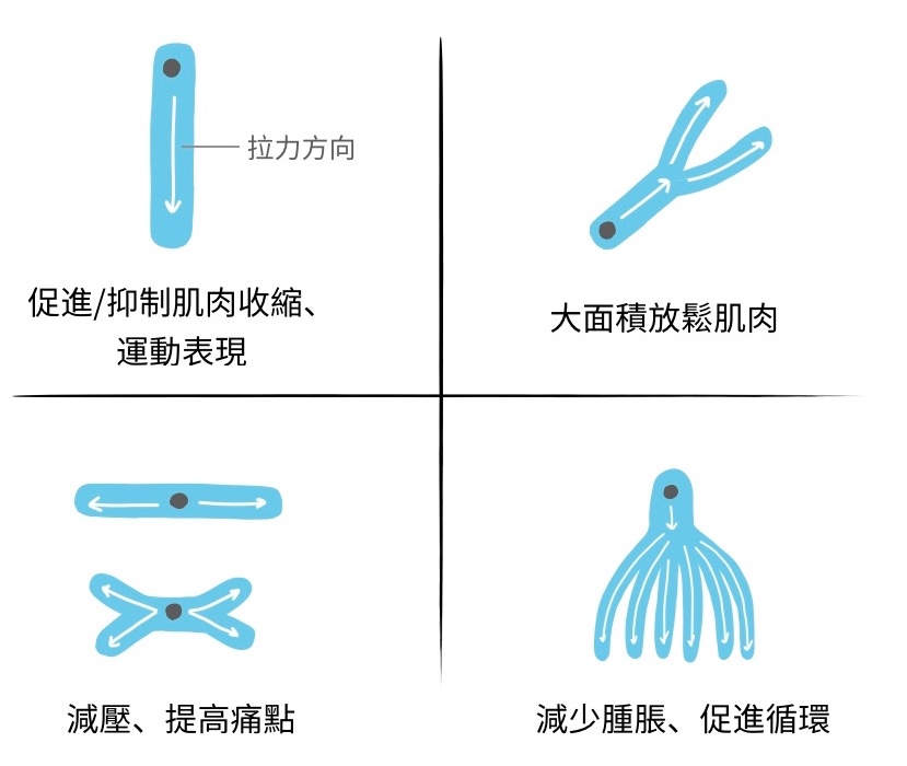 目前肌貼的貼法非常多種,而針對臨床的問題端看施作者的思考邏輯,因此同樣的問題每個施作者貼紮的方式可能都不同,以下介紹四種較常見的貼法(I型、X型、Y型、網狀):