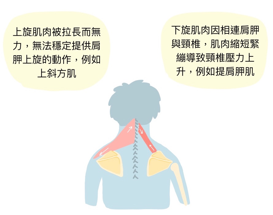綜合以上兩個原因,造成肩胛上旋肌群拉長無力,下旋肌群越來越活化,導致肩胛骨習慣性下旋。