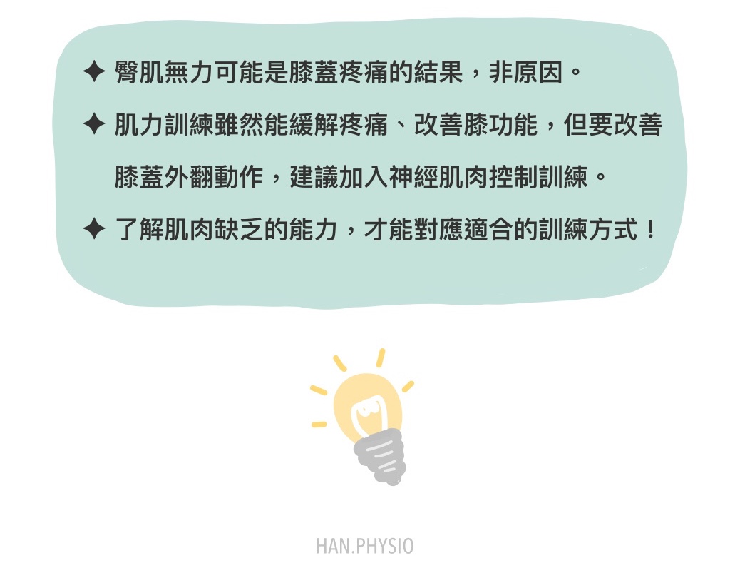 膝蓋外翻是一個主要發生在冠狀面(Frontal plane)的動作,即使臀肌的力量提升,若患者在一般的功能性動作還是習慣外翻、對側骨盆掉下去那可能需要的並不是加強肌力,而是神經肌肉控制的訓練!