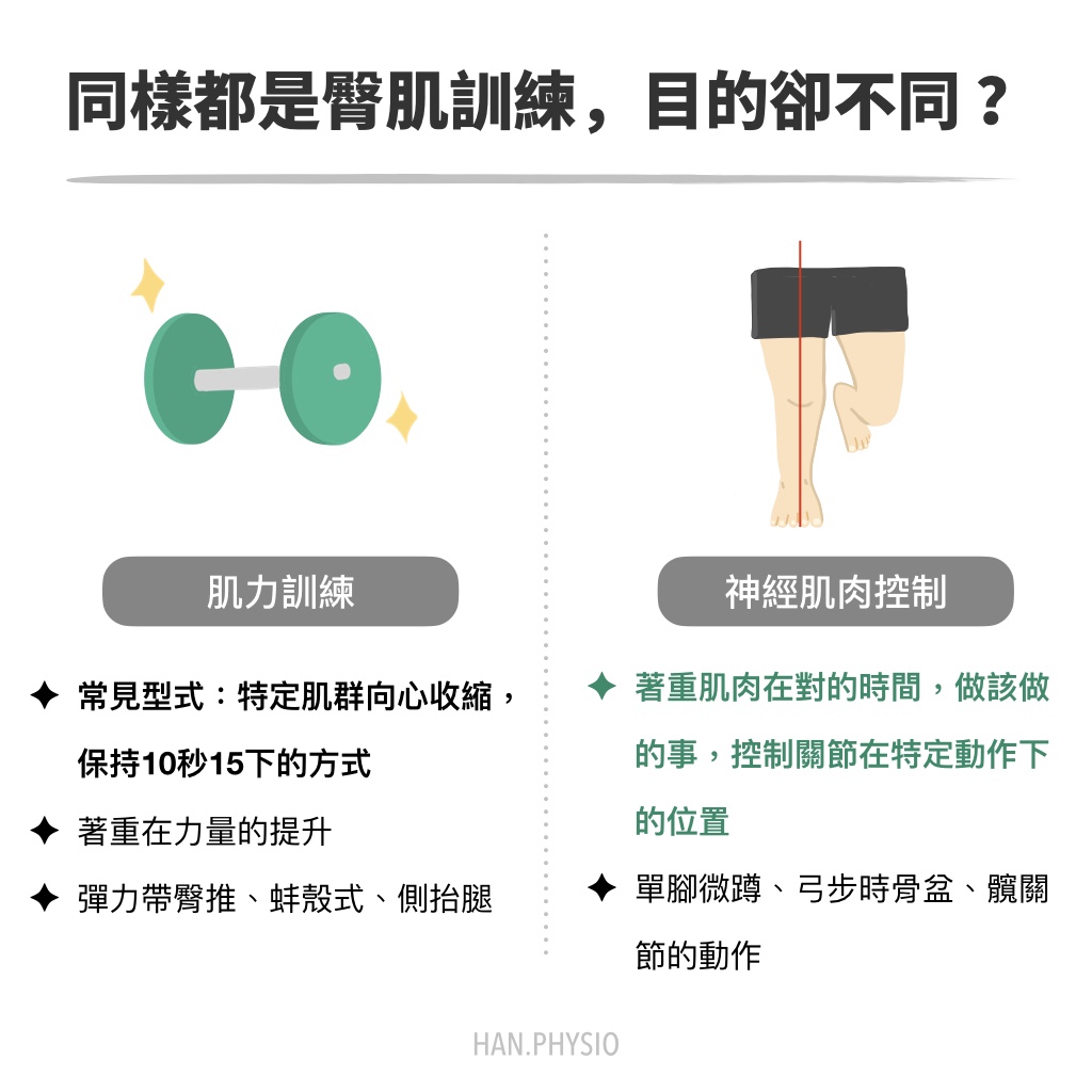 相對地,神經肉控制則是著重在肌肉收縮的時間點,觀察肌肉有沒有在對的時間做該做的事,例如:單腳站膝蓋微彎時,模擬患者可能出現症狀的動作(比如:下樓梯動作),檢視髖關節是否保持不內收、內旋的動作,並保持骨盆不掉向對側,研究顯示經過12~16週的神經肌肉控制訓練,可以有效改善不正確的膝蓋力學姿勢(Mascal CL et al., 2003)。