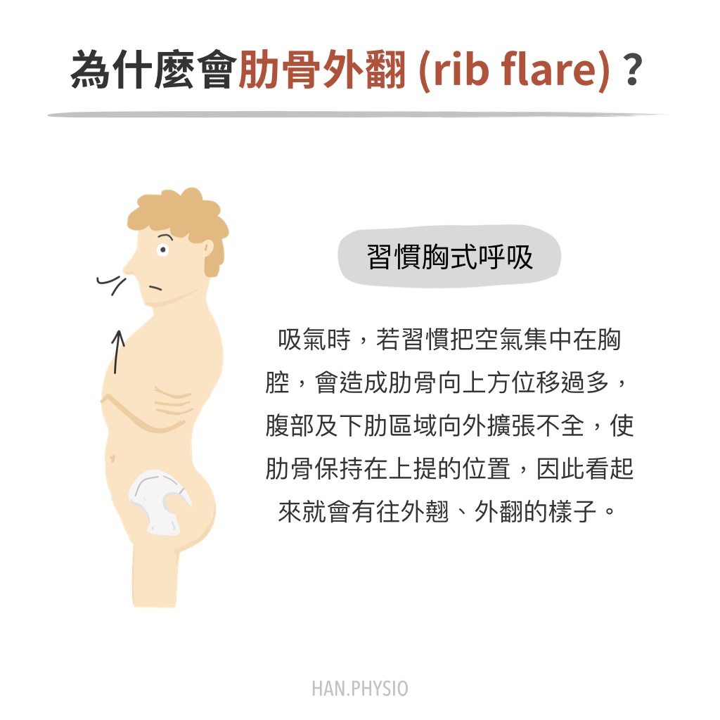 呼吸沒有絕對正確的方式,但如果過度依賴某一種方式來吸取氧氣,那可能就會有點問題衍生出來了,當一個人平靜呼吸時,若習慣用胸式呼吸法,那在吸氣時空氣會集中在我們的胸腔裡,這使的主要的呼吸肌肉~橫隔膜無法有效收縮下沉,下肋骨無法擴張完全,導致肋骨向上方位移太多,而這樣的呼吸方式會使肋骨一直在上提的位置,肋骨也就因此看起來有往外翹、外翻的樣子。