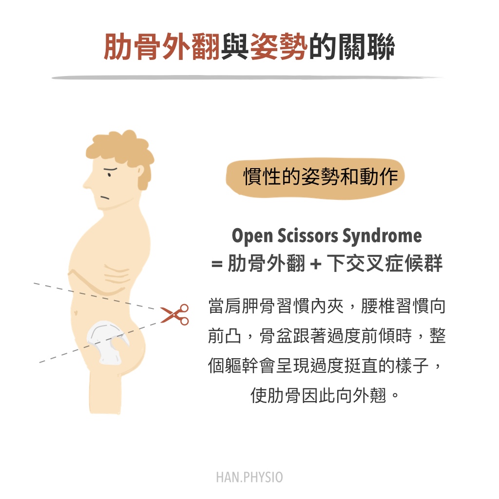 肋骨外翻常伴隨著下交叉症候群,兩者合併起來統稱「Open Scissors Syndrome」。