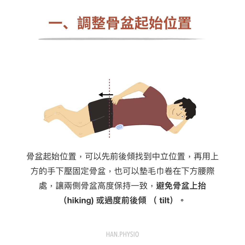 - 側躺時,下方腰際下墊著毛巾卷,讓腰際不下沉,倒持兩邊骨盆一樣高。
