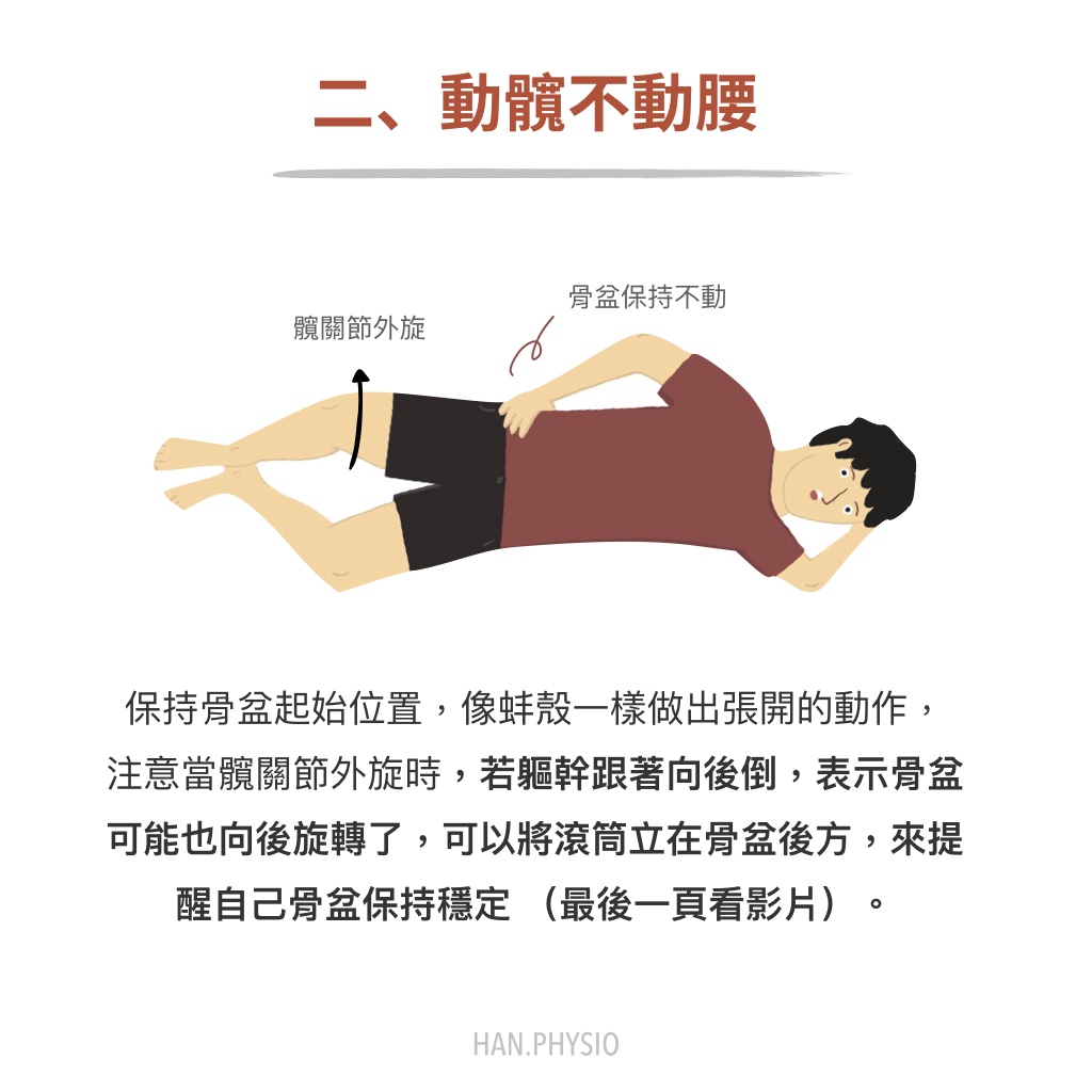- 每做一次髖關節外轉,上方的手就監測骨盆有沒有跟著跑,做完一次就確認骨盆位置是否還在正中位置。