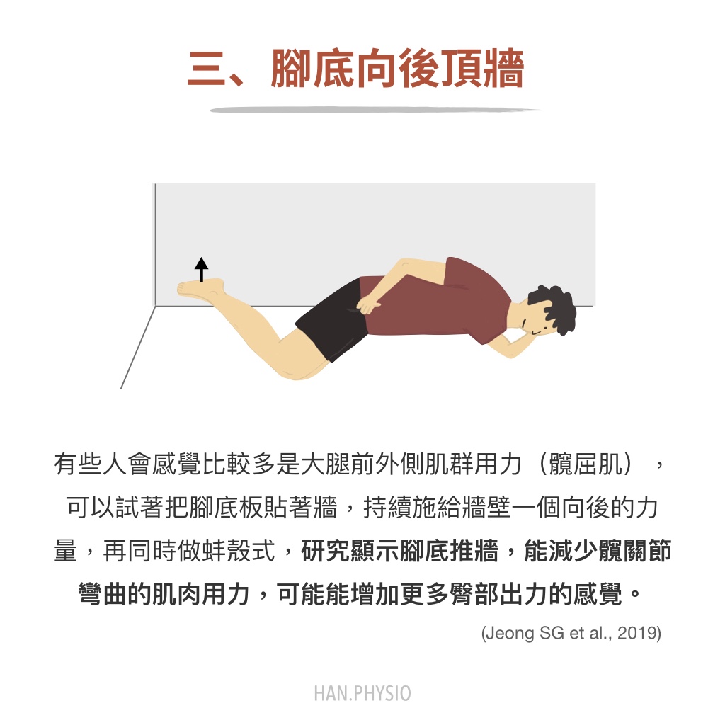 有些人在做蚌殼式會覺得大腿前外側會出比較多力,這可能是習慣用髖屈肌來代償,因此可以請個案上方或雙腳腳板貼在牆壁上,上方腳板給牆壁一個向後的力量,保持頂著並做髖關節外旋動作,有研究指出這樣的方式能減少大腿前測的髖屈肌出力(Jeong SG et al., 2019),可能能使個案想做出更多髖關節伸直動作,使臀部有更多的感受,當然也可以讓髖關節伸直多一些,與身體呈一直線下做髖關節外旋,這樣對於臀中肌後束會有更多刺激。
