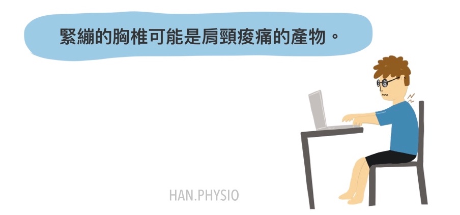 研究指出慢性頸部疼痛(chronic neck pain)的人,在不同速度的步態中,胸椎的旋轉活動度與健康成人相比較低,但胸椎的活動度並不是造成肩頸疼痛的原因之一(Falla D et al., 2017),另外在姿勢方面,雖然研究指出駝背( thoracic kyphosis)和頭前傾的姿勢相關,但和頸部疼痛並無直接相關(Joshi S et al., 2019),依目前的研究證據,胸椎受限可能是肩頸疼痛下的產物,肩頸疼痛的原因可能與心理層面、壓力等其他因素有關。
