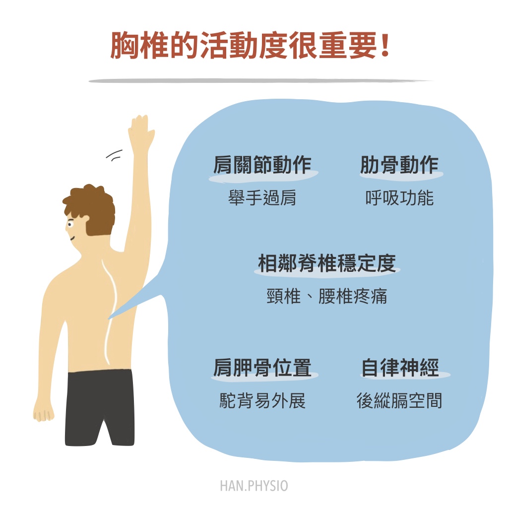 例如:舉手過頭需要胸椎挺直的活動、胸椎活動度若受限卡住可能會影響肋骨擴張程度(呼吸功能),而駝背不易挺直的胸椎容易讓肩胛骨向外展,胸椎活動度卡住也可能使頸腰椎活動度過大,另外,胸椎周遭也是自主神經位置,過度挺直或駝背都可能壓迫到後縱隔組織,影響自主神經系統功能喔!