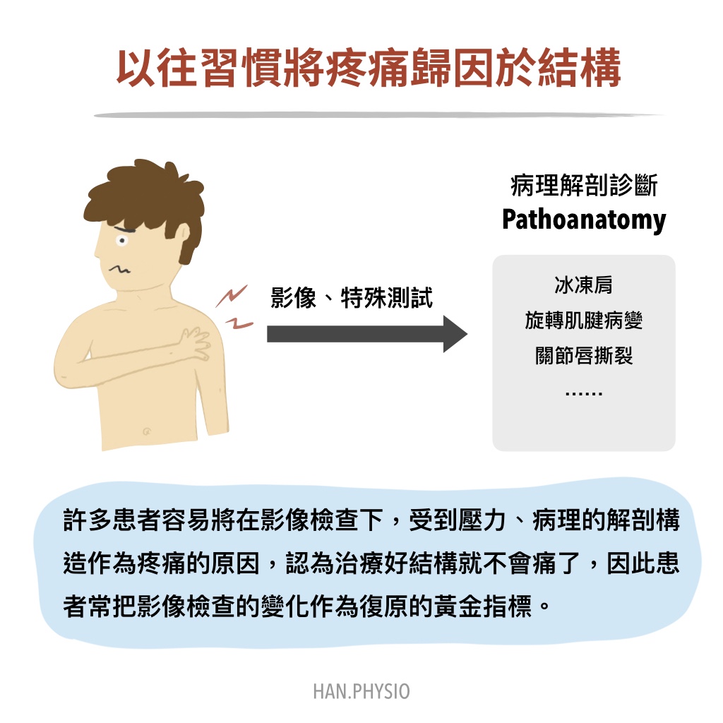當一位肩膀痛的患者來看診時,醫師可能會從幾個面向來檢查評估,包含病史詢問、影像學檢查、特殊測試(special test)、動作測試等,最後醫師會統整檢查結果給予診斷,一般常會將疼痛歸因於發現的病理結構,比如旋轉肌撕裂、肩關節囊發炎、脊上肌肌腱病變……等。