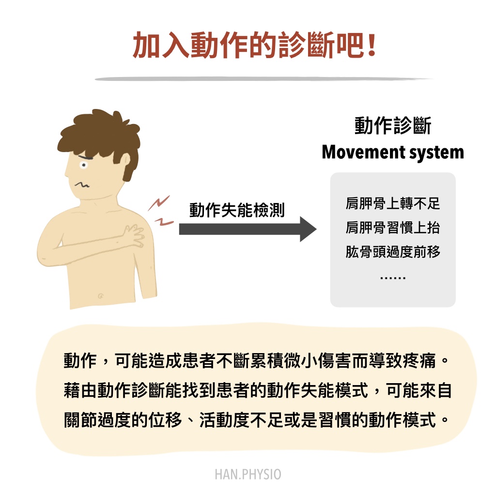 以肩膀脊上肌損傷為例,在以往的診斷裡我們會認為肌腱的損傷是造成肩膀疼痛的原因;若以動作的角度來想,也可能是習慣的肩膀動作模式,造成身體在特地動作時不斷累積傷害,而造成肌腱損傷進而產生疼痛。