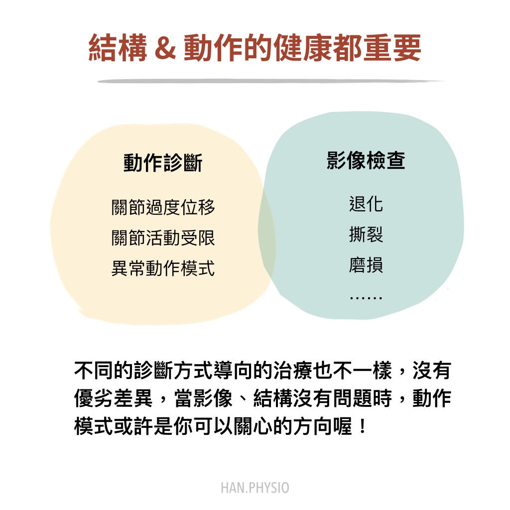 從以上的例子,我們可以看到動作診斷和病理結構診斷所導向的治療是不同的,沒有優劣差異,只是對於大部分的患者,常把影像檢查視為復原的黃金指標,「影像沒問題我也好了」,是一個很大的迷思和誤解,而除了動作診斷外,當然還有許多系統在判斷疼痛來源時需要去考量,像是生物心理社會因子、疼痛處理過程等,期待後續再和大家分享疼痛的相關因子。