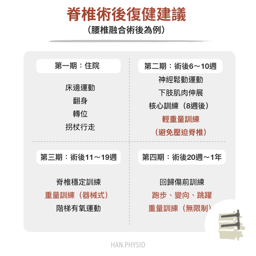 第四期(術後約五個月後):大概術後半年左右可以開始銜接傷前的訓練,此階段已經可以開始嘗試跑步、變向、跳躍的動作,重量訓練方面過去文獻上並沒有特別限制,下肢的自由重量訓練可以慢慢嘗試,唯垂直脊椎受力的動作,還是要注意訓練後背包有沒有產生不適,或是造成下肢出現神經性的症狀,建議回歸傷前的訓練時,訓練強度和訓練量還是要依照治療師與防護員的安排,並與你的開刀醫師討論後再執行會較安全。