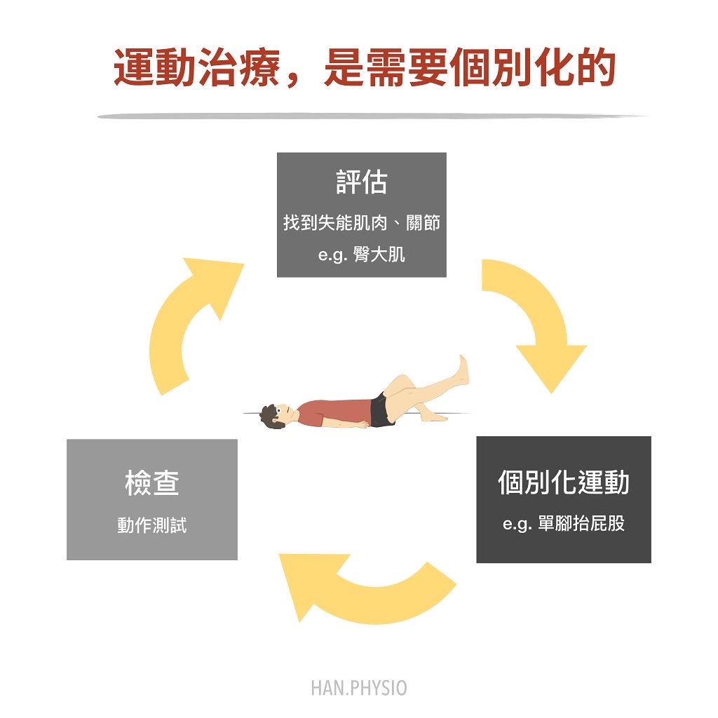 因為每位個案的需求和實際狀況都不一樣,同樣都是下背痛的人,有些是彎腰痛、有些是後仰痛,彎腰痛的有些會麻有些不會麻,因此個人化的運動處方是需要經過物理治療師的檢查評估後,才能給予教導的,並不是像網路上的影片好像每個人都適用一樣,如果一支影片做完你就不會痛,那真的恭喜你非常幸運,但大多數的人都沒那麼幸運,才會需要物理治療師的幫忙。