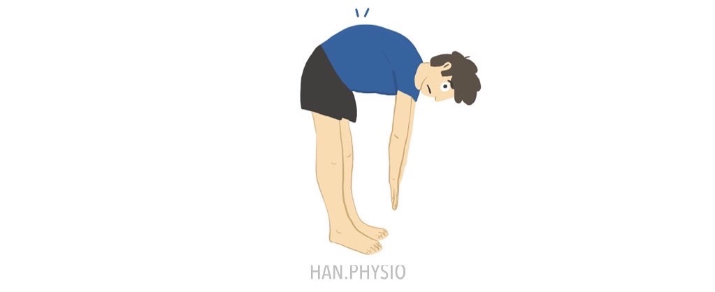 而骨盆和腰椎和髖關節也存在著這種節律,以理想的骨盆腰椎節律(Lumbo-pelvic rhythm)來說,當我們軀幹向前彎曲雙手摸地時,會從彎腰、骨盆前傾、髖關節彎曲,依照這樣的動作次序來幫助我們前彎,但如果當一位下背痛的個案,他的骨盆習慣擺在後傾的位置時,髖關節就很難做出彎曲的動作,導致胸腰椎需要彎曲更多,背部累積無形的壓力和疼痛,所以看到這裡,你應該能理解到骨盆能夠自由地前後傾,或是做出其他方向的動作,對於下背痛的個案是非常重要的。