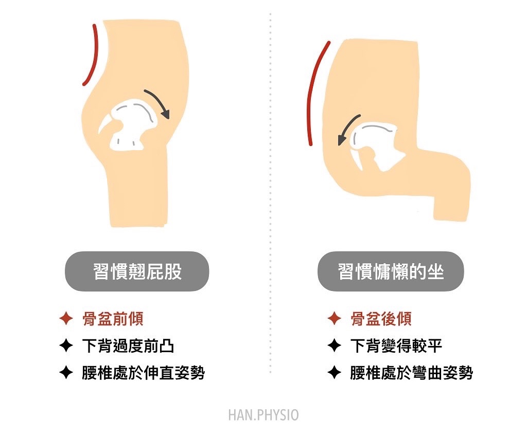 骨盆前後傾,是我們對骨盆動作的描述,它和身體上的疼痛並沒有絕對相關,但當我們很習慣只做關節的單一方向動作時,肌肉就容易適應當下的姿勢,造成肌肉的長度變緊或是拉長。