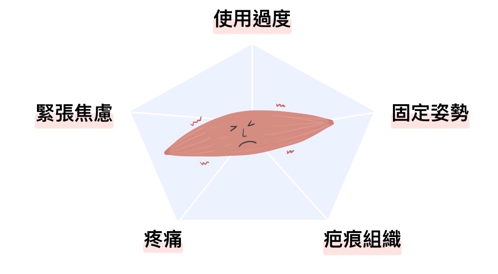 當我們太久沒運動去騎腳踏車,隔天起床時雙腳的緊繃可能來自使用過度;擔心被主管罵的上班族,會議報告前前肩頸堅硬的原因可能來自焦慮緊張的心情;整天躺在沙發上看電視的爸爸,腰痠緊繃感可能來自固定的姿勢……
