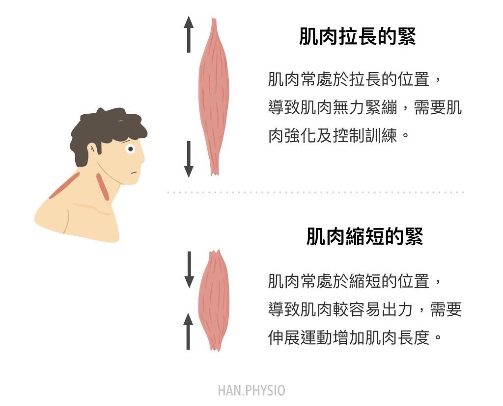好比因為常頭前傾(forward head)的人,可能使頸部前側淺層的肌肉縮短,後測頸部伸直肌群被拉長,這樣的情況緊繃感其實都有可能出現,但如果都採拉筋的方式,對於已經被拉長的頸部伸直肌群,可能會越拉越無力,造成肌肉更緊繃!