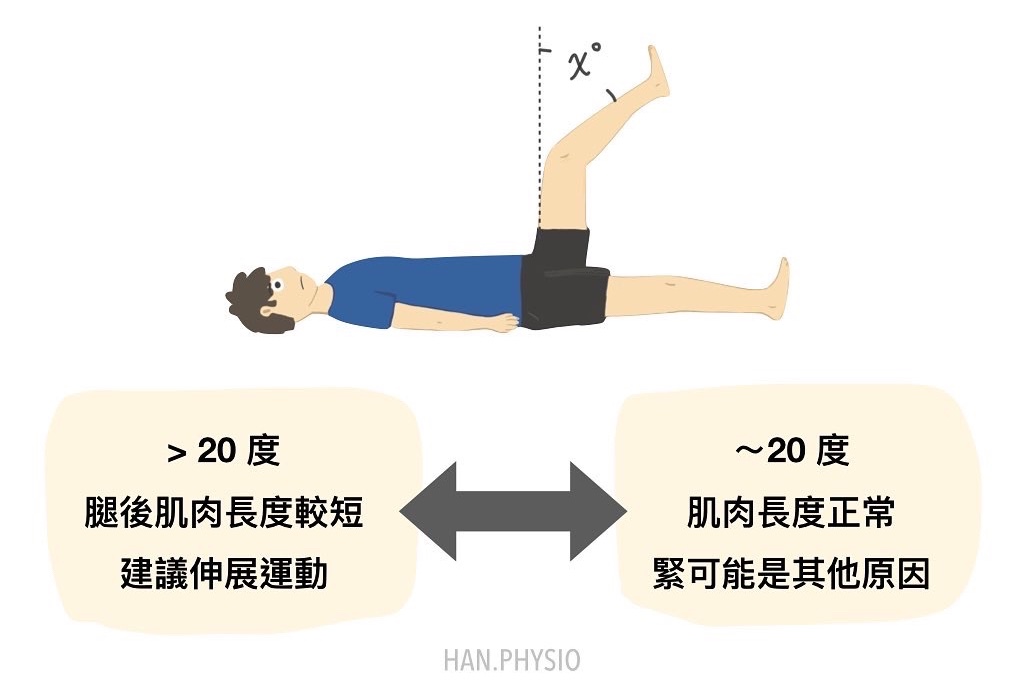 以大腿後側肌群(Hamstring)為例,許多人在彎腰摸地時會覺得腿後緊繃,我們可以請患者在躺姿下把大腿上抬至90度,膝蓋慢慢伸直來觀察脛骨和垂直線的夾角,推測腿後肌的肌肉長度是否足夠。