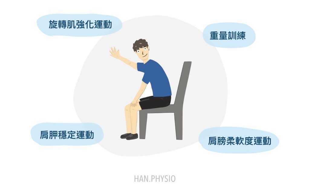 在近年的回顧文獻(Pieters L et al., 2020),整理了常見有效的肩夾擠治療方式,包含運動治療、徒手治療、震波治療、類固醇注射、雷射和超音波治療,但在眾多的治療方式裡,只有運動治療對於短期和長期的療效較有高度的研究證據,其他的治療方式尚需要更多高品質的研究來佐證,所以運動治療對於肩膀夾擠是相當重要的喔!研究指出運動治療除了能減緩肩膀疼痛、恢復關節活動度,適當的負重訓練也能促進肩膀的本體感覺,減少肌肉力量退化。