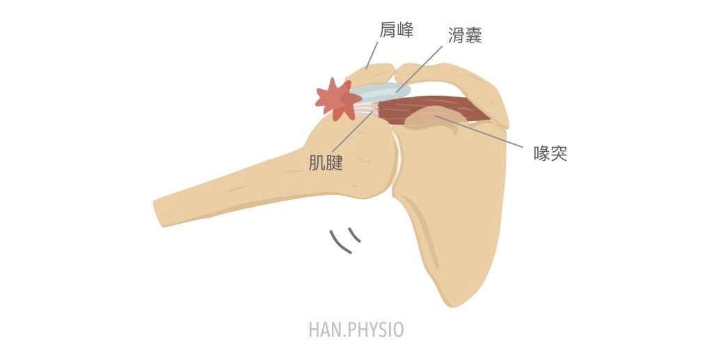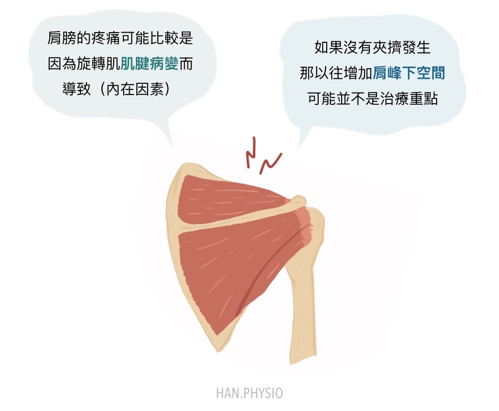 外在因素是指肩膀的夾擠,是因為不好的姿勢、肩峰的形狀、肩胛骨動作失能或是使用習慣等外在原因,導致肩膀上抬時夾擠到肌腱而產生疼痛;相對地,內在原因則是指旋轉肌肌腱本身可能就有些問題,比如鈣化、撕裂等造成肩膀上抬時不關節穩定而產生夾擠問題。