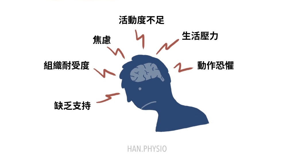對!疼痛就是一種大腦接受到傷害訊號而傳遞給身體的警訊,疼痛可能受到動作恐懼、焦慮、壓力、動作障礙、社會支持等因素導致,舉例來說長期不敢彎腰的人就有可能是因為「不敢」彎腰這個動作或是想要好卻一直沒有好,這種焦慮的情緒和壓力,而造成動作時的疼痛。