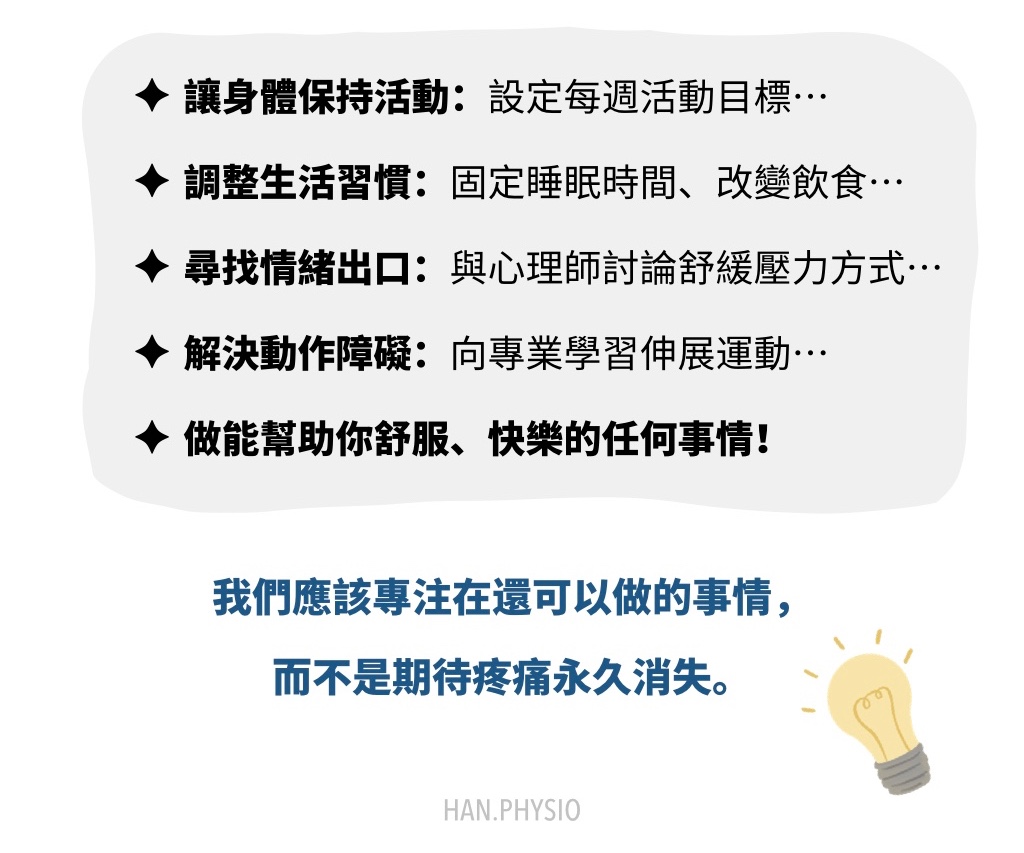 疼痛是正常的反應,也是生活的一部分,當面臨慢性疼痛時,若執著在單一的疼痛原因可能會更讓我們一直專注在「痛」這件事,可以試著列出容易引發疼痛的壓力源,試著改變一兩項壓力源,可能就對疼痛有很大的改變,大家可以參考看看上述的方法,身體有疼痛還是可以活得好好的喔!