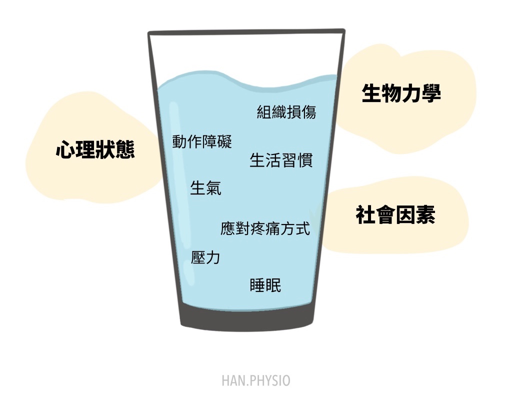 慢性疼痛怎麼產生的?什麼原因導致疼痛的?物理治療師及疼痛專家Greg Lehman 把慢性疼痛比喻成一杯水,可以看到圖中杯子裡的水代表容易導致疼痛的壓力源(stressor),包含了組織損傷、動作障礙、壓力及睡眠等等的因素,所以疼痛壓力源並非只與身體結構有關,和個案的生物力學、情緒心理狀態和社會層面都有關係,縱觀來說慢性疼痛與我們的生活各個層面習習相關!