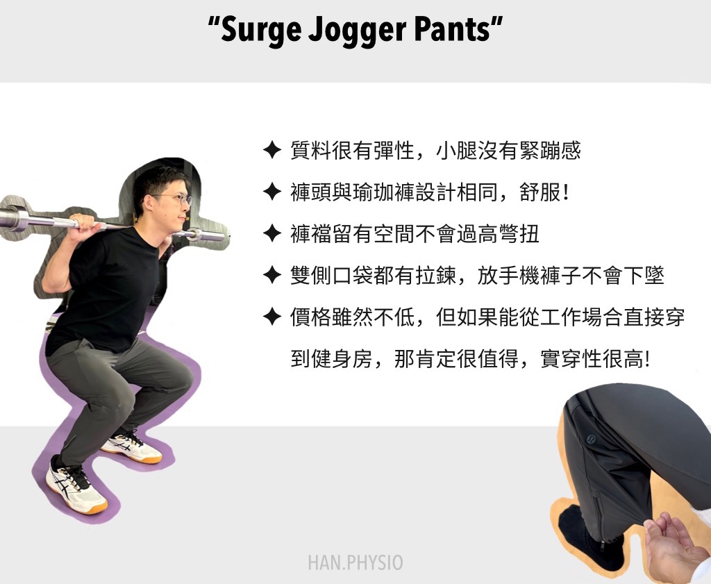 在工作以及健身訓練穿著後,我對這件surge jogger pants真的十分滿意,以往也穿過各大運動品牌的jogger pants,但這件的質料和功能,能讓我直接在工作下班後直接穿去運動,我最喜歡的設計一個是褲頭採瑜伽褲的型式,很舒服不會過緊,再來是小腿肚雖然有設置拉鍊但卻相當有彈性,小腿不會有勒緊感,最後是雙口袋都有拉鍊,放手機也不會掉下去,不得不說材質很輕薄又透氣十分適合台灣的天氣,尤其是南部一年大概有2/3都在烈日下,雖然價格不低,但如果能讓你在工作和運動訓練場所穿梭,那肯定是很值得的!